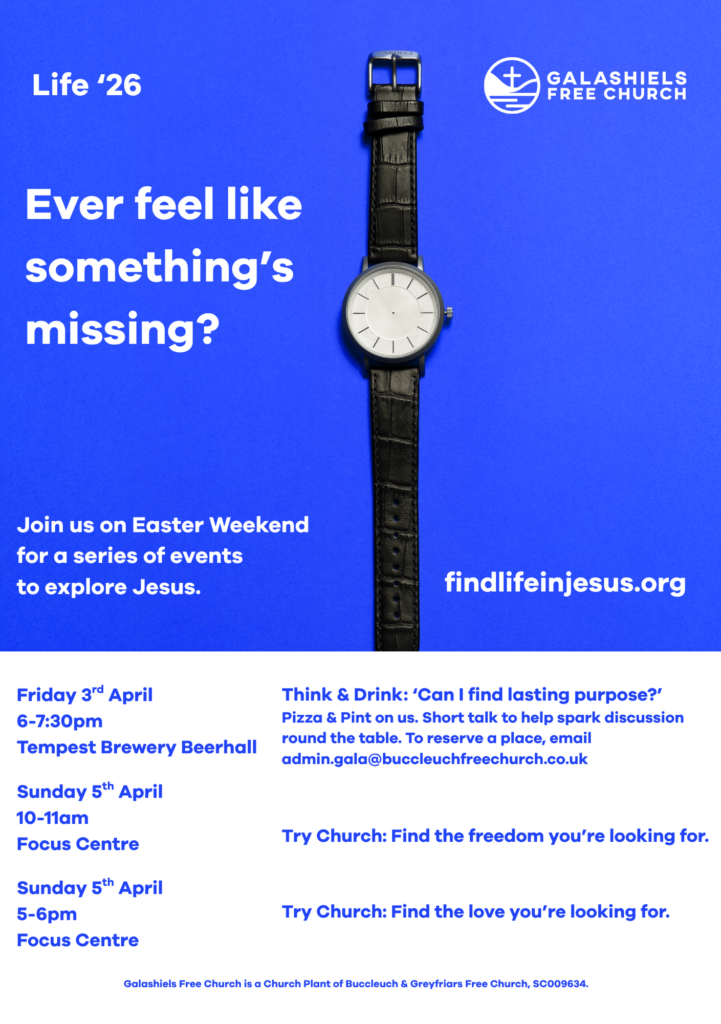 Pizza & Pint on us. Short talk to help spark discussion round the table. To reserve a place, email admin.gala@buccleuchfreechurch.co.uk or contact us through the website.